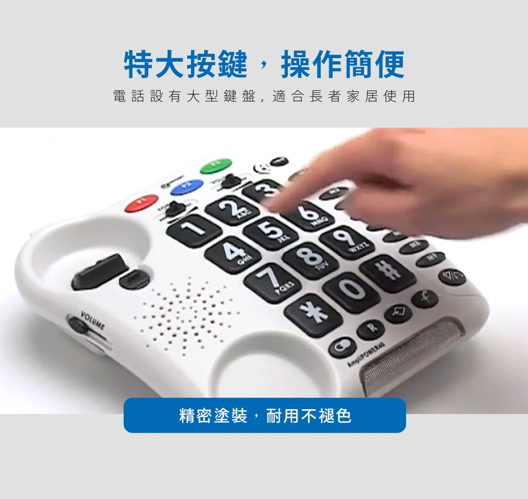 長者在使用家居電話時,有機會遇到電話按鍵或鈴聲過小等問題。此產品具備多項人性化設計如:特大按鍵、自動重撥和特大鈴聲等功能,尤其適合視力或聽力不佳的長者使用